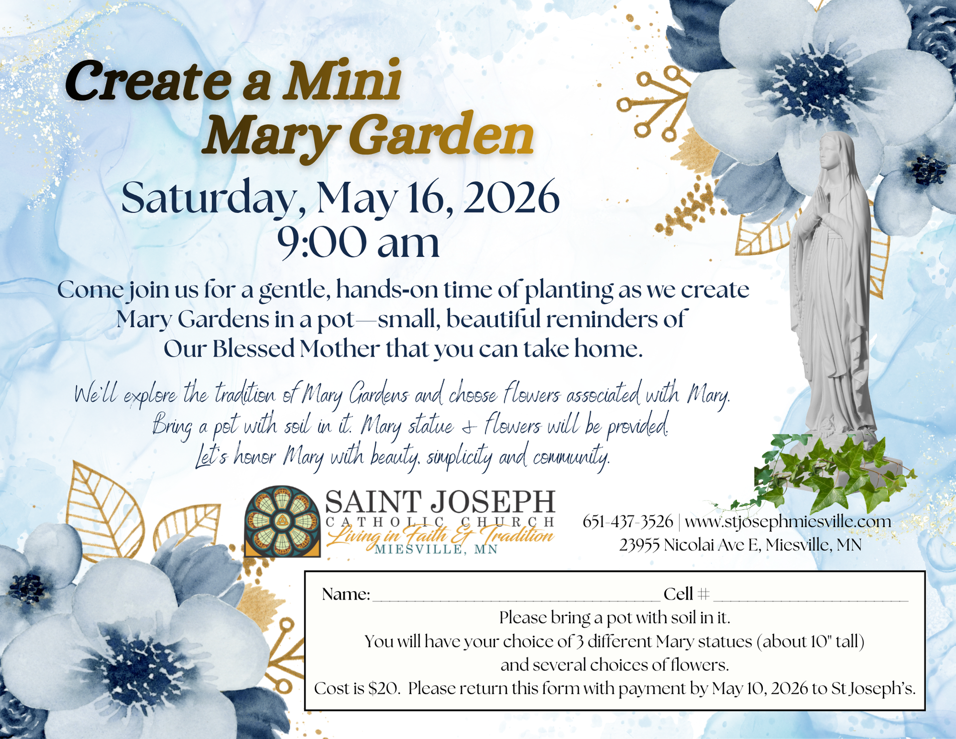 Cost is $20, which includes plants and your choice of a 10" statue of Mary.